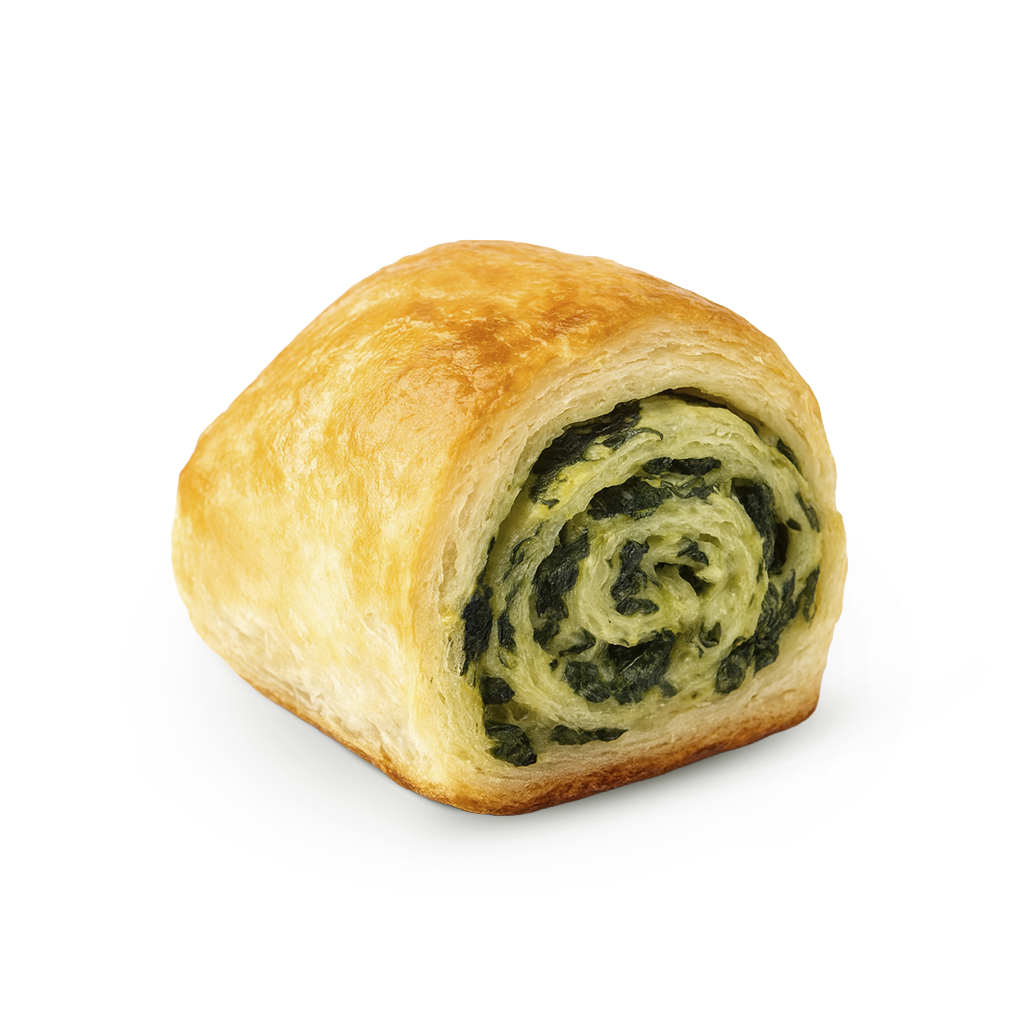 Pastelitos de masa hojaldrada horneada hasta quedar dorada y crujiente, rellenos con una mezcla cremosa de espinaca salteada, cebollita finamente picada y queso, logrando un sabor suave pero muy sabroso. Son una alternativa vegetariana ideal para pasabocas, refrigerios y eventos donde se busca algo ligero, diferente y hecho con ingredientes frescos.